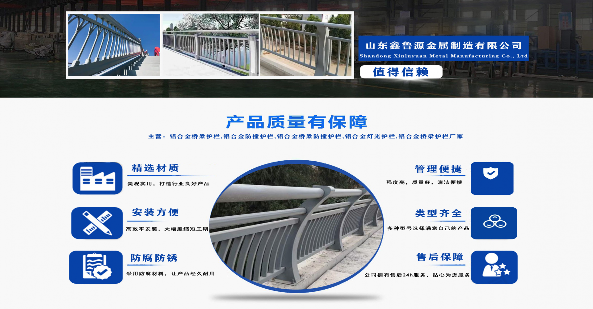 山東鑫魯源金屬制造有限公司主要經(jīng)營:鋁合金橋梁護欄,鋁合金防撞護欄,鋁合金橋梁防撞護欄,鋁合金燈光護欄,不鋁合金橋梁護欄廠家,環(huán)波梁橋梁護欄,環(huán)波梁防撞護欄。質(zhì)量可靠、經(jīng)濟實用的顯著特點。公司為客戶提供可靠售后保障,堅持“以品質(zhì)立足、服務(wù)求發(fā)展”,愿與各界朋友精誠合作、攜手發(fā)展!  服務(wù)優(yōu)勢:真誠的服務(wù)理念、完善的服務(wù)體系。公司專業(yè)力量充足;工程案例眾多、從業(yè)經(jīng)驗豐富;公司以可靠質(zhì)量的產(chǎn)品,合理的價格,完善的售后服務(wù),能夠滿足市場各個企業(yè)的需求。  企業(yè)精神:執(zhí)著追求 持續(xù)創(chuàng)新執(zhí)著追求,就是堅持不懈、堅定從容,專注于自己的事業(yè),把能做的事情做好,不斷克服困難、把握機遇,贏得未來。  持續(xù)創(chuàng)新,就是生命不息、創(chuàng)新不止,通過持續(xù)實施技術(shù)創(chuàng)新、管理創(chuàng)新、市場創(chuàng)新,獲取持續(xù)的競爭優(yōu)勢。...